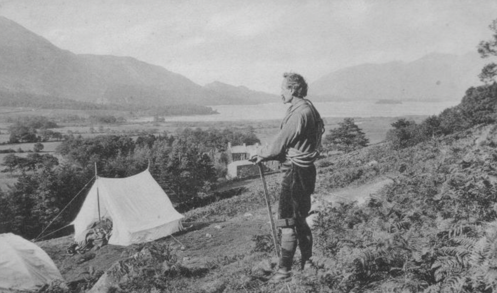 Millican spent the rest of his life living largely out-of-doors, wintering in a forest hut in Essex, and spending his summers in the Lake District, where he launched a second career as England’s most eccentric mountain guide. He posed for postcards and posted advertising his services, promising not only camping and guided climbs, but also “mountain rapid shooting, rafting and hairbreadth escapes” at a time when contemporary guides were leading hill walks.
