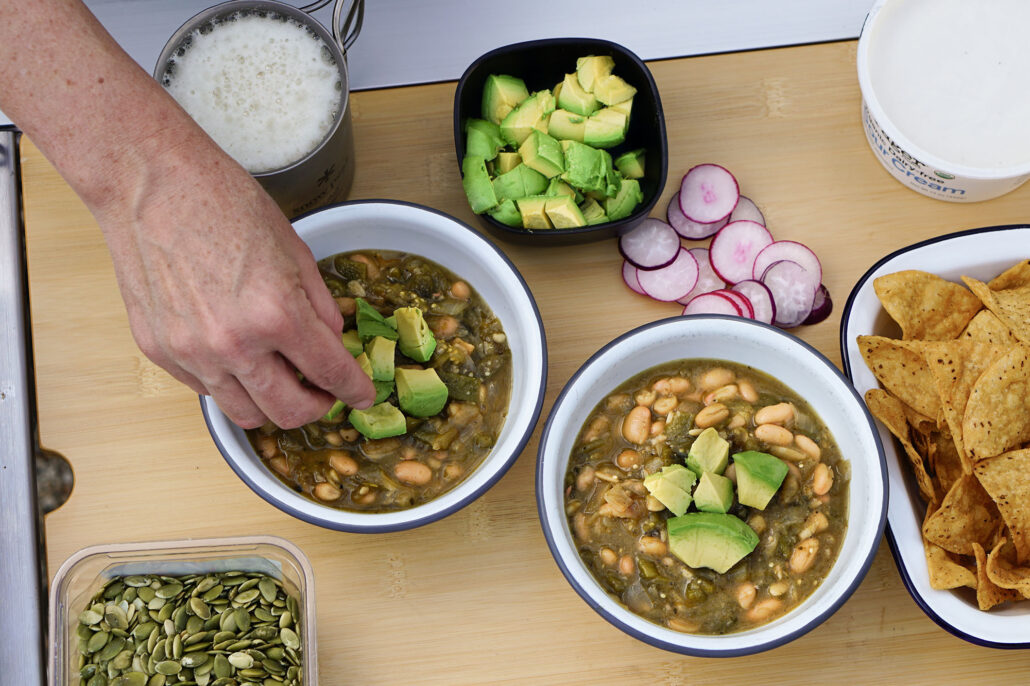 French toast, mighty meal salad, and white bean chili verde.